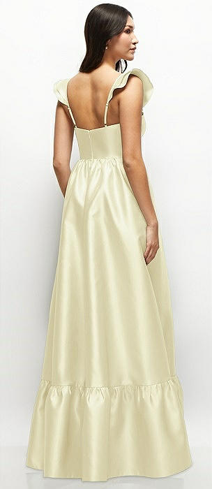 Bow-Shoulder Satin Maxi Dress with Asymmetrical Tiered Skirt in butter yellow