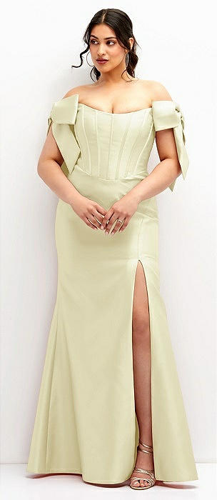 Off-the-Shoulder Bow Satin Corset Dress with Fit and Flare Skirt in butter yellow