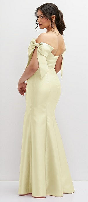 Deep V-back Satin Trumpet Dress with Cascading Bow at One Shoulder in butter yellow