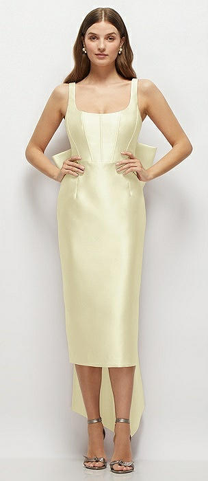 Scoop Neck Corset Satin Midi Dress with Floor-Length Bow Tails in butter yellow