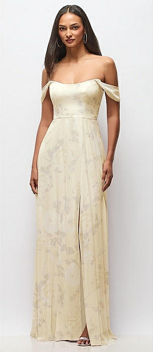 Bow-Shoulder V-Back Chiffon Gown with Front Slit in butter yellow floral