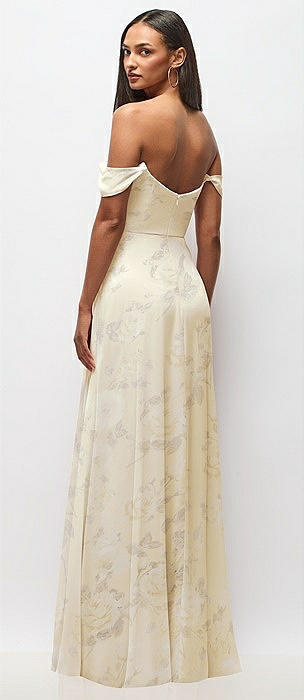Off-the-Shoulder Bow Floral Satin Corset Dress with Fit and Flare Skirt in butter yellow floral