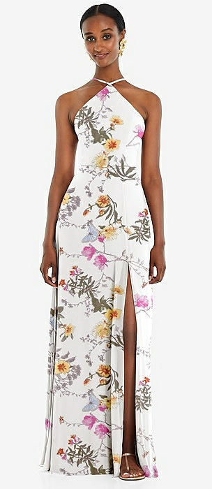 Stand Collar Halter Maxi Dress with Criss Cross Open-Back in butterfly botanica ivory