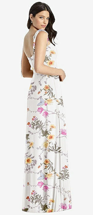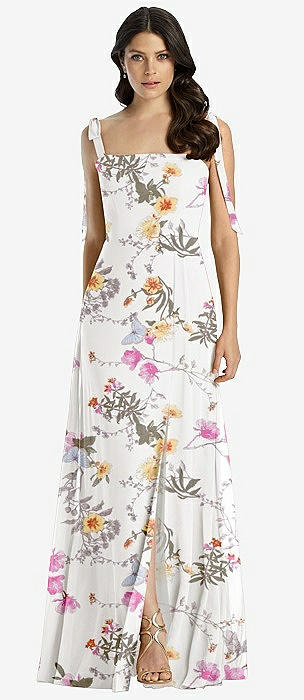 Tie-Shoulder Chiffon Maxi Dress with Front Slit in butterfly botanica ivory