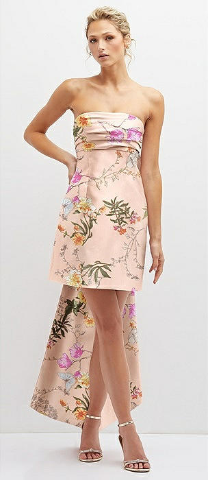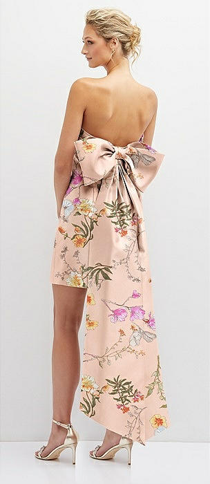 Floral Strapless Satin Column Mini Dress with Oversized Bow in butterfly botanica pink sand