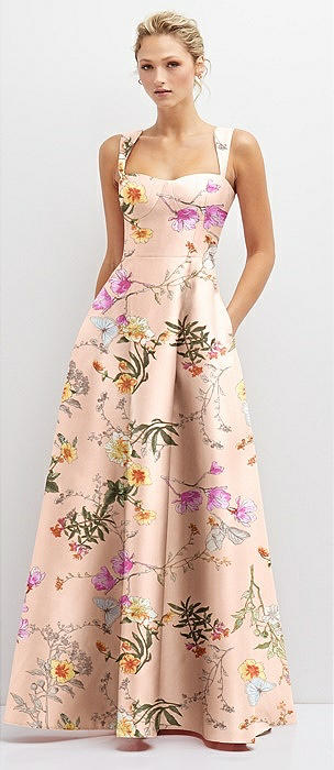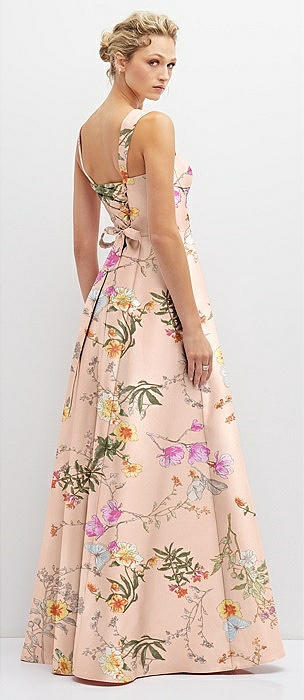 Floral Lace-Up Back Bustier Satin Dress with Full Skirt and Pockets in butterfly botanica pink sand