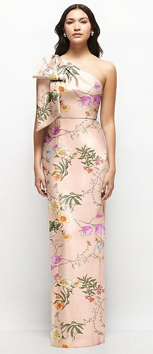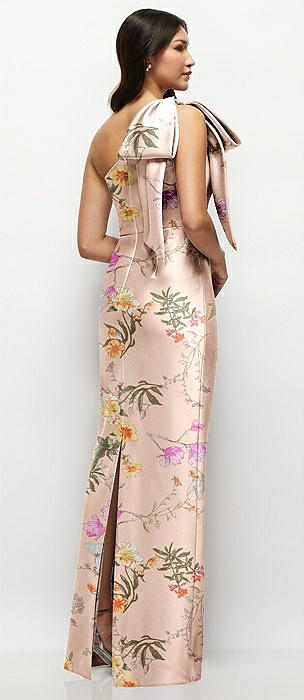 Oversized Bow One-Shoulder Floral Satin Column Maxi Dress in butterfly botanica pink sand