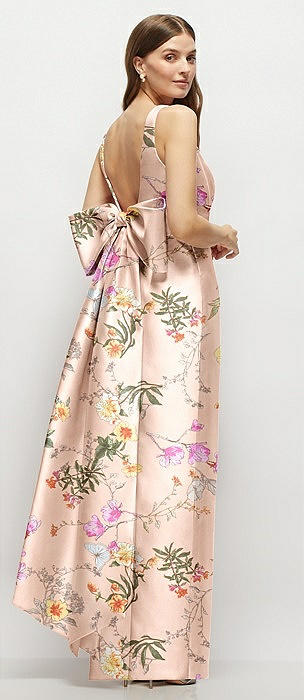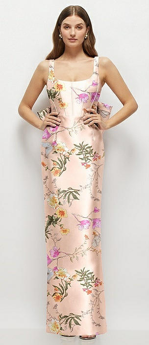 Floral Scoop Neck Corset Satin Maxi Dress with Floor-Length Bow Tails in butterfly botanica pink sand