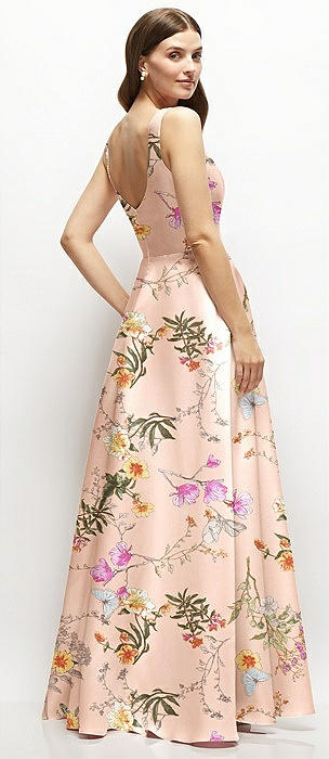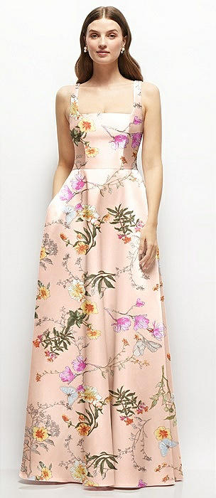 Floral Square-Neck Satin Maxi Dress with Full Skirt in butterfly botanica pink sand