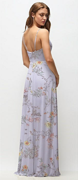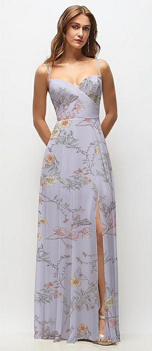 Wrap Bodice Floral Chiffon Maxi Dress with Adjustable Spaghetti Straps in butterfly botanica silver dove