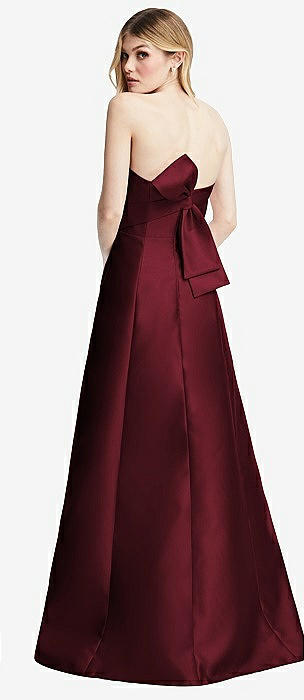 Strapless A-line Satin Gown with Modern Bow Detail in cabernet