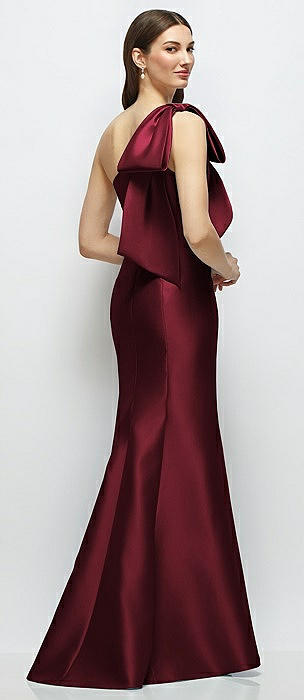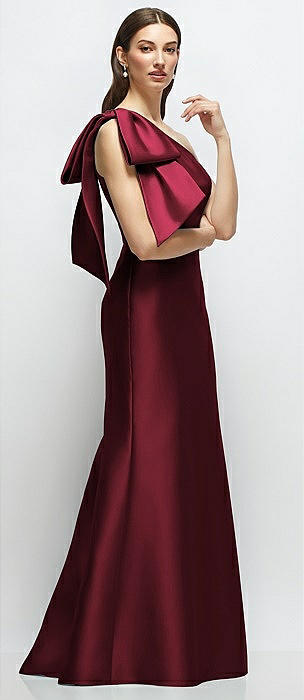 Bow One-Shoulder Satin Trumpet Gown in cabernet