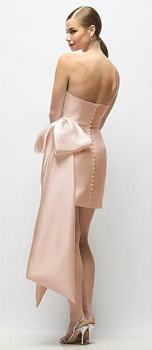 Strapless Pleated Draped Satin Mini Dress with Dramatic Long Tail Bow & Covered Buttons in cameo