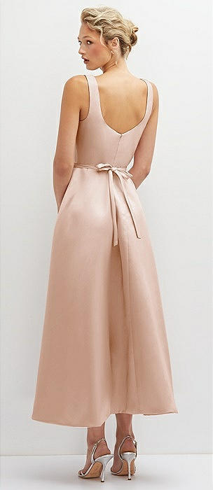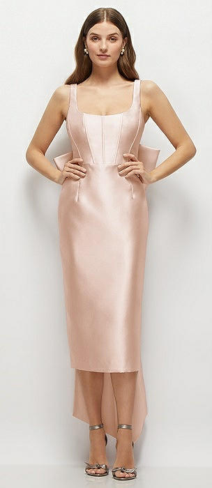 Scoop Neck Corset Satin Midi Dress with Floor-Length Bow Tails in cameo