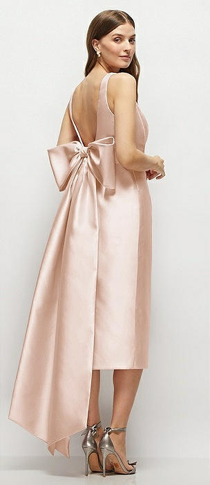 Scoop Neck Satin Column Midi Dress with Bow at Empire Waist in cameo