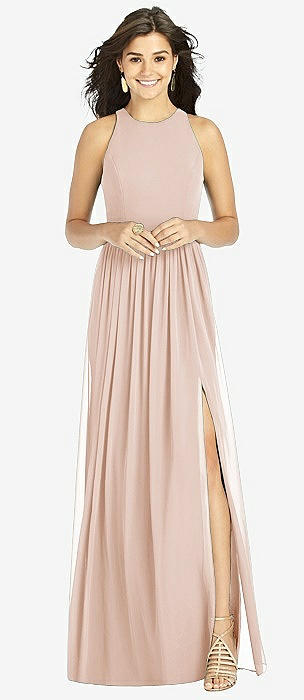 Shirred Skirt Jewel Neck Halter Dress with Front Slit in cameo