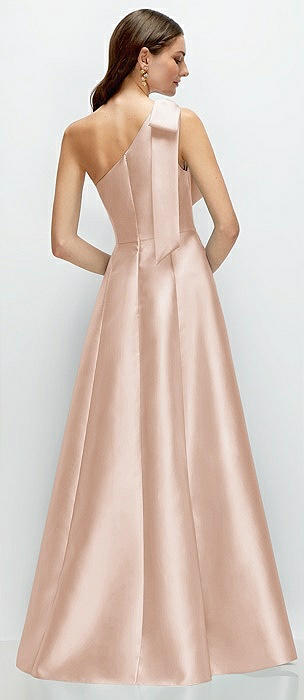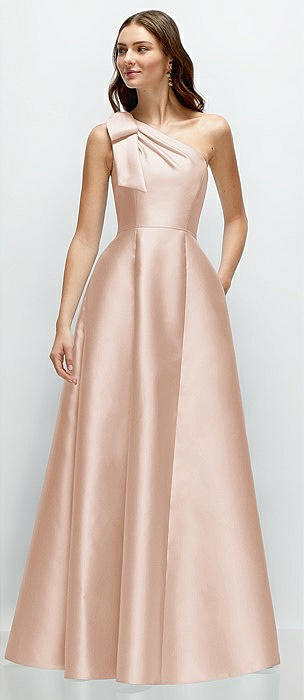 Bow One-Shoulder Full A-Line Satin Maxi Dress in cameo