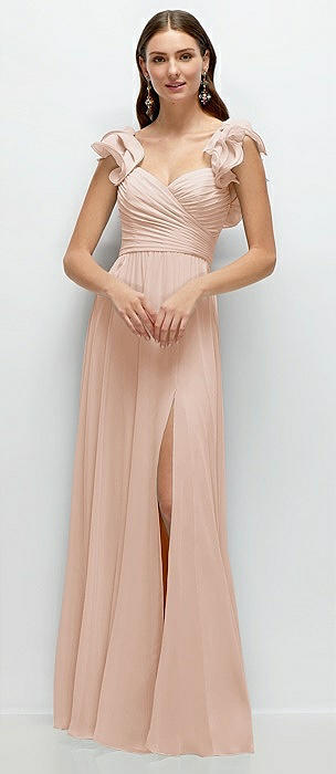 Convertible Ruffle Strap Chiffon Maxi Dress with Full Circle Skirt in cameo