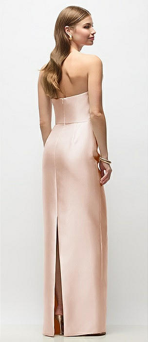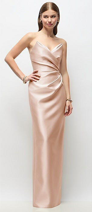 Strapless Asymmetrical Draped Satin Column Maxi Dress in cameo