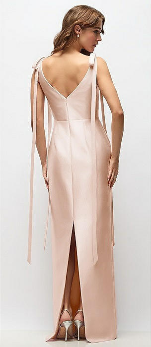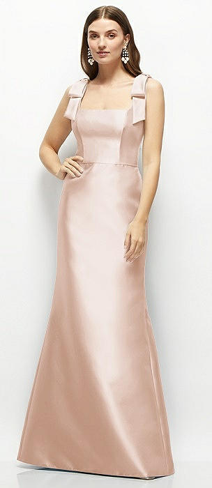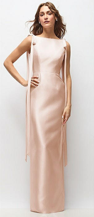 Bateau Neck Satin Column Maxi Dress with Exaggerated Tail Bow Straps in cameo