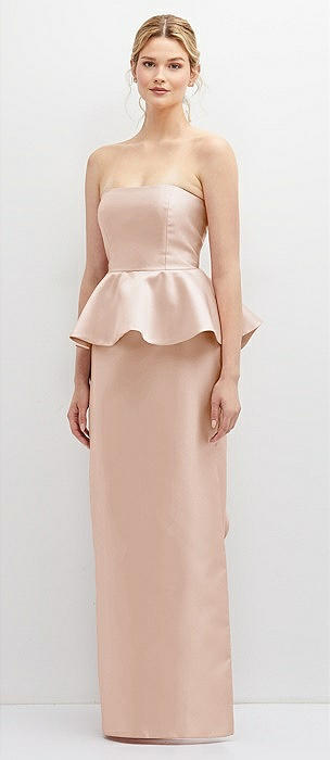 Strapless Satin Maxi Dress with Cascade Ruffle Peplum Detail in cameo