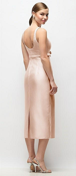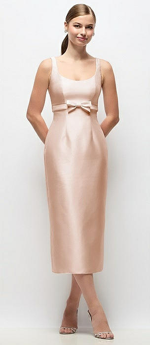 Scoop Neck Satin Column Midi Dress with Bow at Empire Waist in cameo