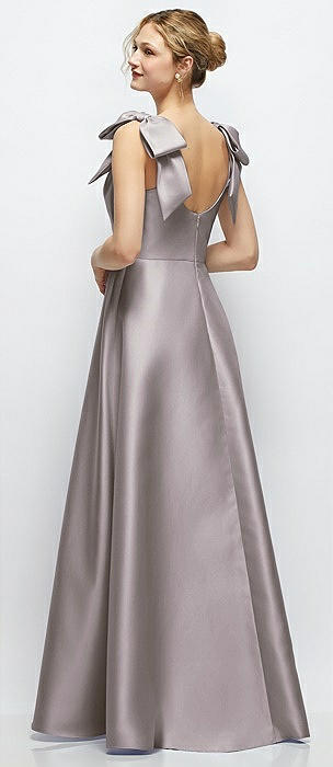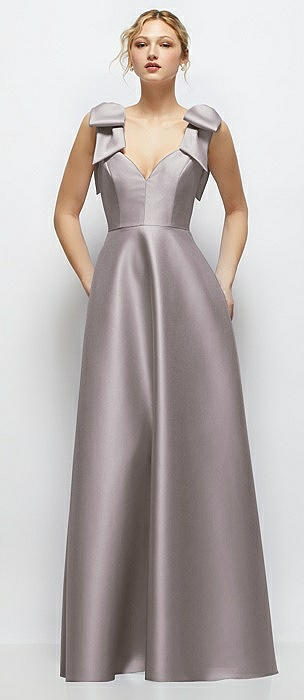 Deep V-Neck Satin Ball Gown with Shoulder Bows in cashmere gray