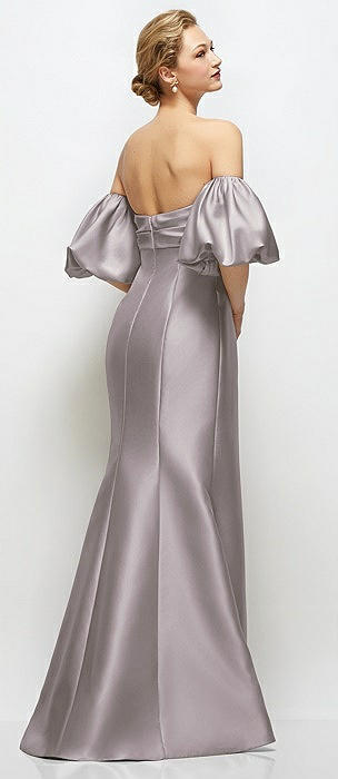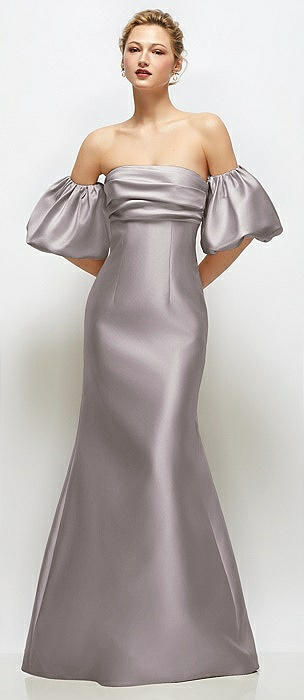 Off-the-Shoulder Puff Sleeve Satin Maxi Dress with Flared Skirt in cashmere gray