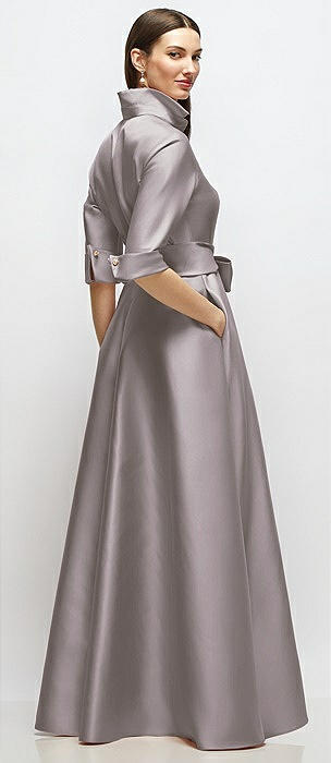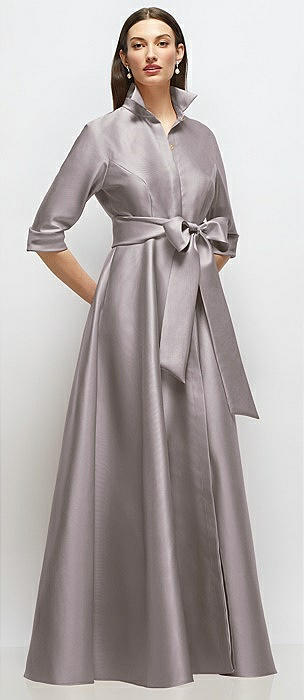 3/4 Sleeve Satin Shirt Dress Gown with Sash and Jeweled Buttons in cashmere gray