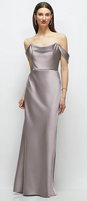 Basque-Neck A-Line Stretch Satin Maxi Dress with Off-the-Shoulder Drape in cashmere gray