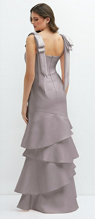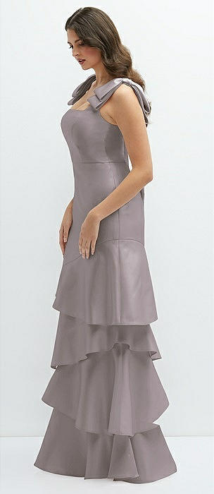 Bow-Shoulder Satin Maxi Dress with Asymmetrical Tiered Skirt in cashmere gray