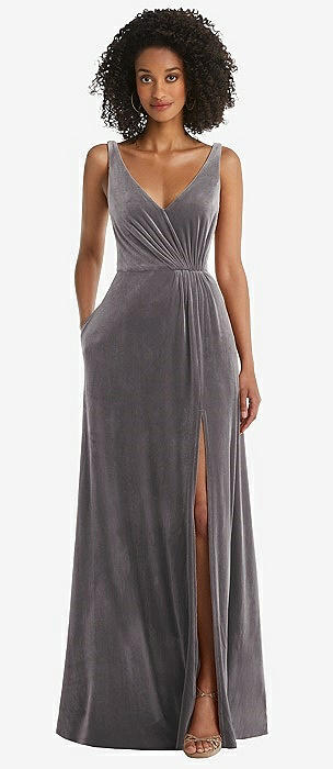 High-Neck Cap Shoulder Pleated Bodice Velvet Column Maxi Dress in caviar gray