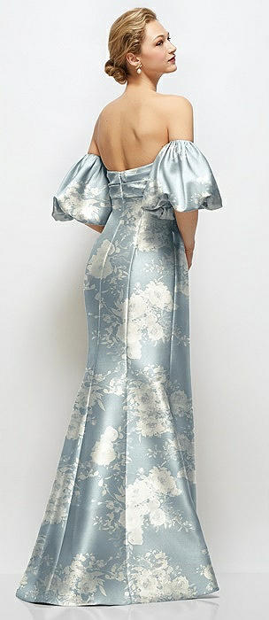 Off-the-Shoulder Puff Sleeve Floral Satin Maxi Dress with Flared Skirt in porcelain blue seraphina floral