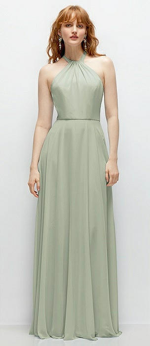 Shirred Halter Chiffon Maxi Dress with Back Sash-Tie Closure in celadon