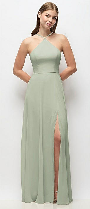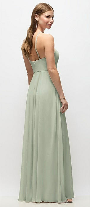 High-Neck Halter Chiffon Maxi Dress with Adjustable Spaghetti Straps in celadon