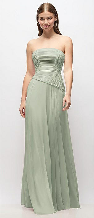 Strapless Chiffon Maxi Dress with Asymmetrical Ruched Drop Waist in celadon