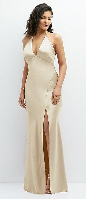 Plunge Halter Open-Back Maxi Bias Dress with Low Tie Back in champagne