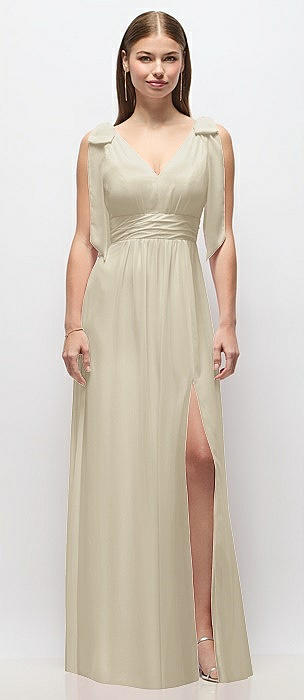 Plunge Neckline Bow Shoulder Empire Waist Chiffon Maxi Dress in champagne