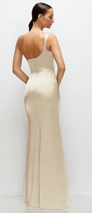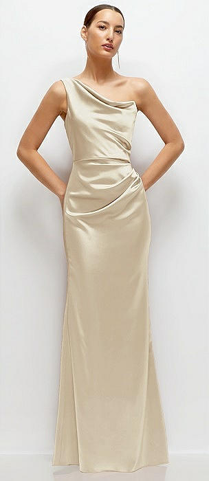 One-Shoulder Cat-Eye Neckline Fit and Flare Satin Maxi Dress in champagne
