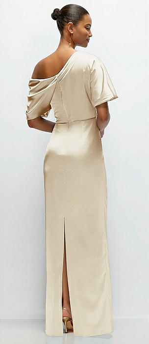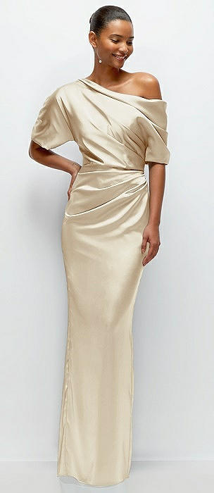 Asymmetrical Off-the-Shoulder Pleated Satin Maxi Dress in champagne