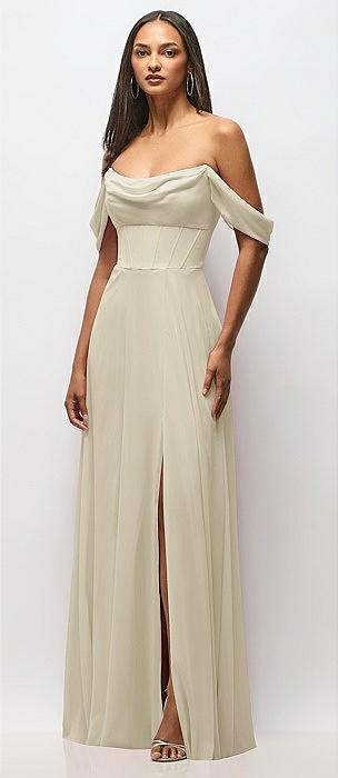 Off-the-Shoulder Basque Corset Chiffon Maxi Dress in champagne