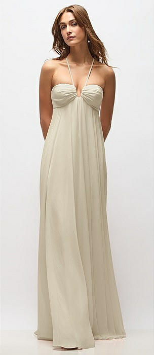 Empire Waist Chiffon Halter Maxi Dress with Convertible Spaghetti Straps in champagne