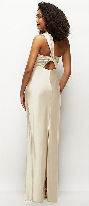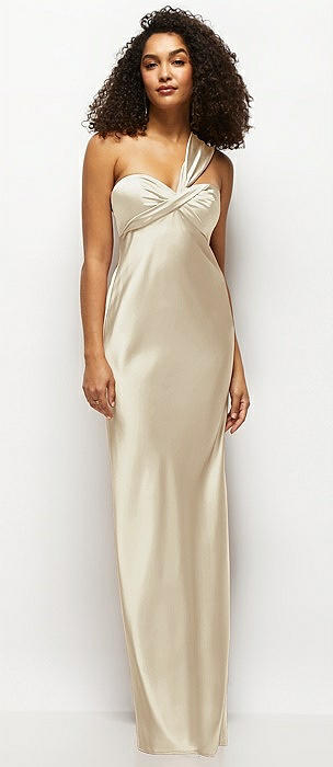 Satin Twist Bandeau One-Shoulder Bias Maxi Dress in champagne