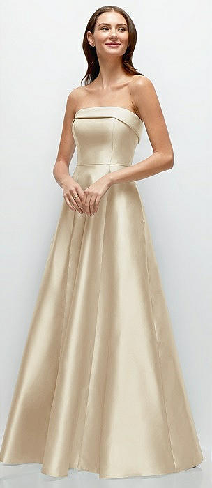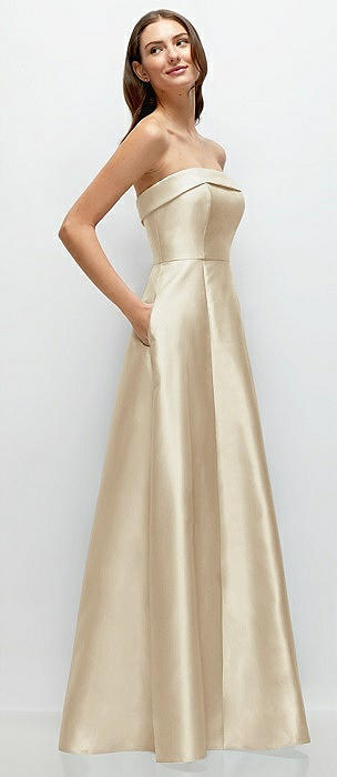 Strapless Bias Cuff Bodice Satin Gown with Pockets in champagne