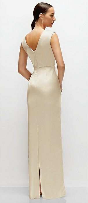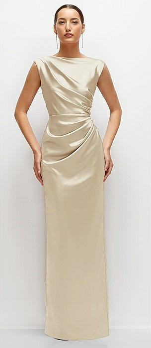 Scoop Neck Draped Column Stretch Satin Maxi Dress in champagne