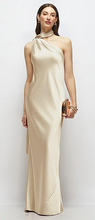 Draped Scarf One-Shoulder Bias Stretch Satin Maxi Dress in champagne