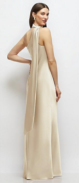 Pleated Halter Bias Satin Maxi Dress with Self-Tie Bow Back in champagne