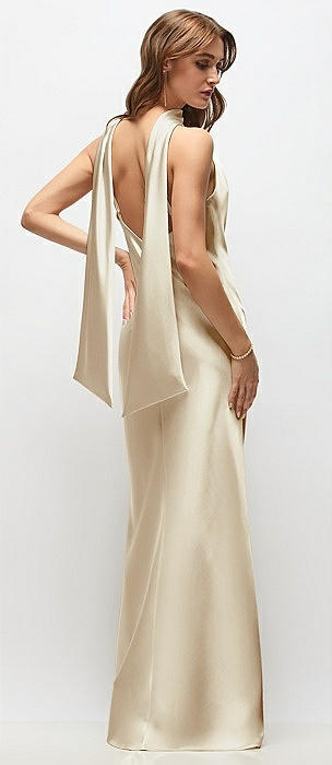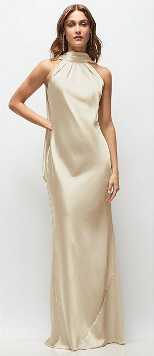 Draped Scarf Halter Open-Back Stretch Satin Bias Maxi Dress with Adjustable Straps in champagne
