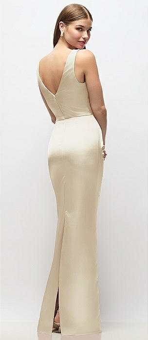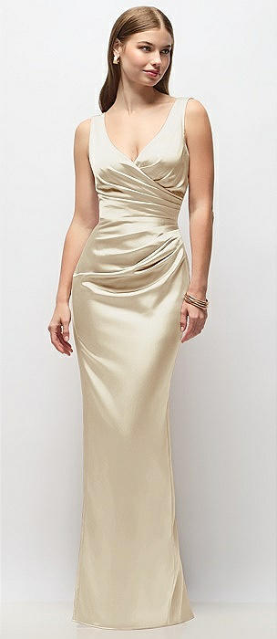 Sleeveless Draped Wrap Bodice Stretch Satin Column Maxi Dress in champagne