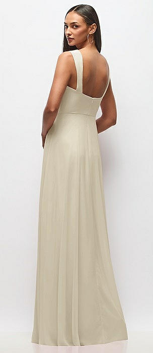 Shirred Shoulder Criss Cross Back Maxi Dress with Front Slit in champagne